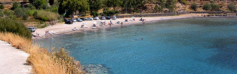 It is located on the south side of the island in a small bay with clear water. It is a sandy, and pebbly at places, beach.
